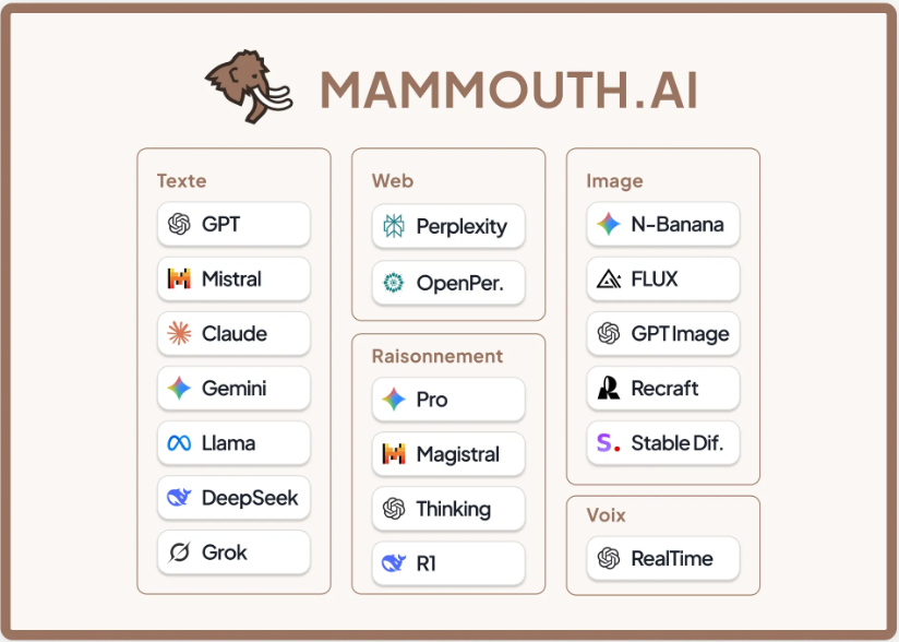 Mammouth AI développe une plateforme d'IA accessible en ligne, qui regroupe plusieurs modèles leader de langage avancés tels que Claude, Mistral, Gemini, Llama, ou encore DeepSeek.