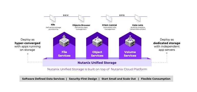 Nutanix Cloud Platform est la plateforme hybride et multicloud de Nutanix, permettant d'exécuter et gérer applications et données de manière unifiée, du datacenter aux environnements cloud publics et périphériques. Nutanix Unified Storage (NUS) en constitue la couche de stockage unifiée, consolidant fichiers (NAS), objets (compatibles S3) et blocs (iSCSI) dans une solution logicielle unique, hautement évolutive et cyber-résiliente.