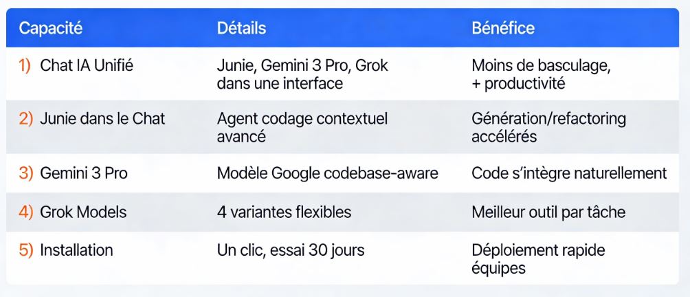 • Chat IA unifié avec Junie, Gemini 3 Pro et Grok